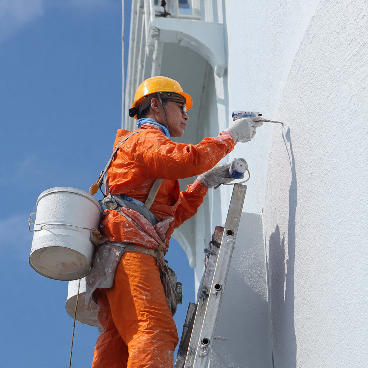 📸 Hình 2: Thợ sơn của Sài Gòn Tower đang thi công lớp sơn phủ bằng máy lăn sơn hiện đại