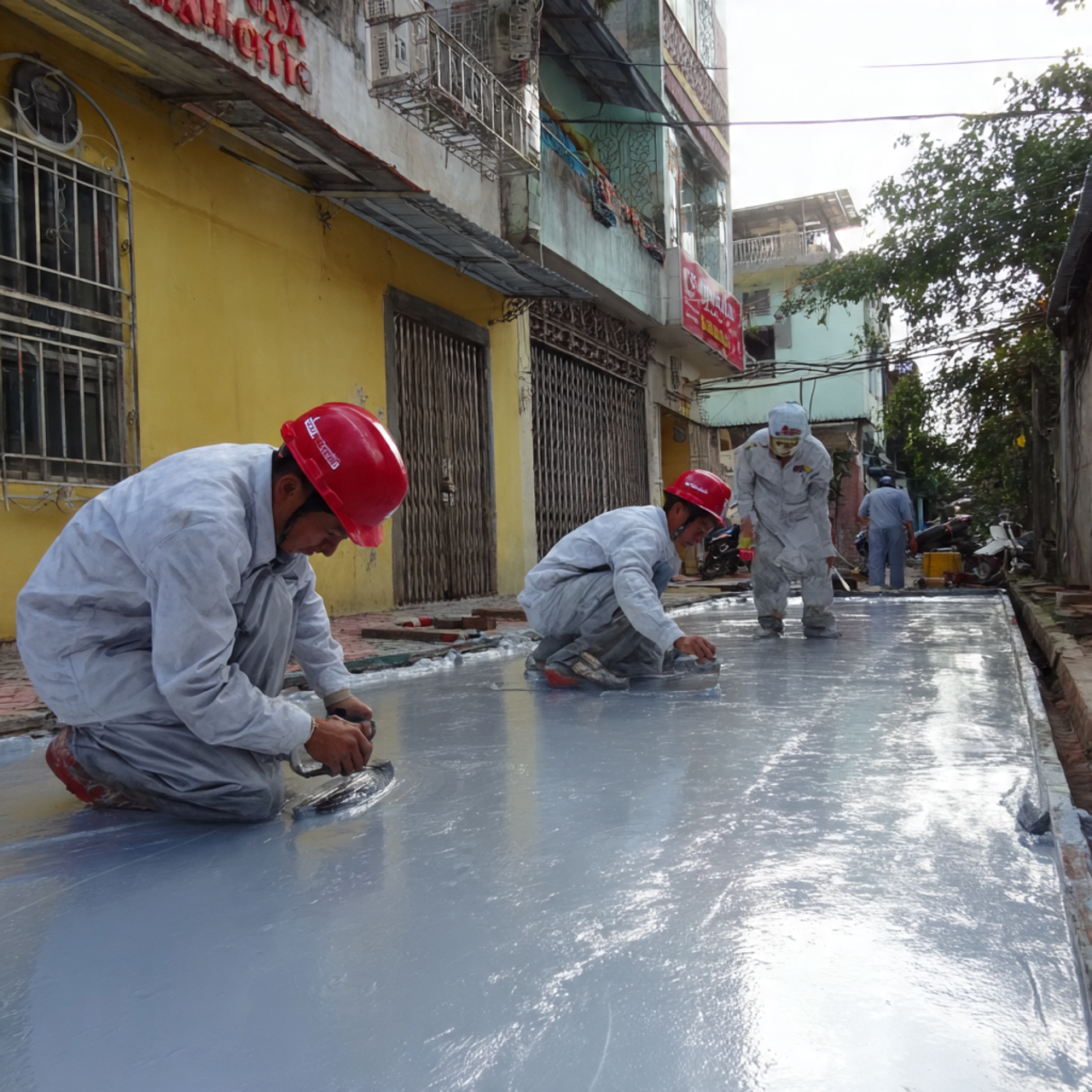 📷 Hình 3: Thợ sơn tại Quận 5 đang thi công lớp sơn lót chống thấm