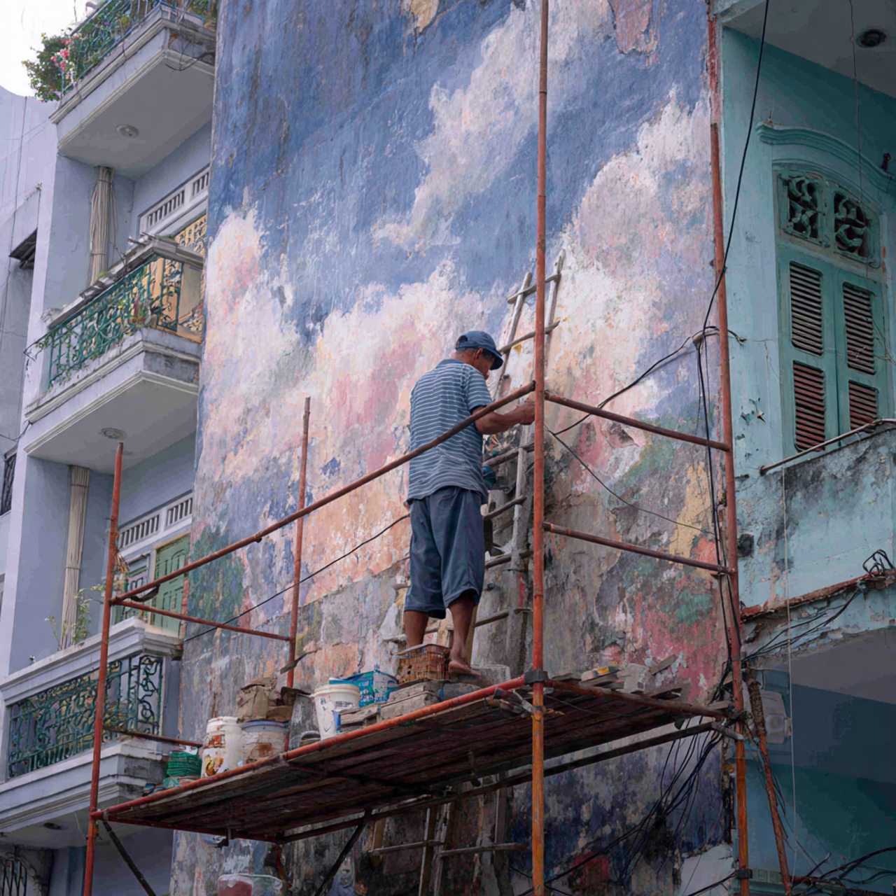 📷 Hình 1: Đội ngũ thi công sơn nhà trọn gói của Sài Gòn Tower đang chuẩn bị bề mặt tường