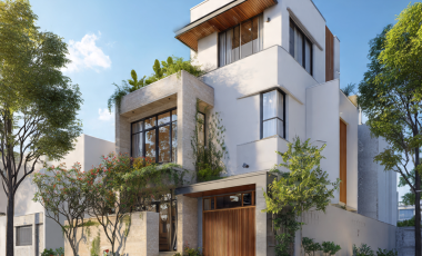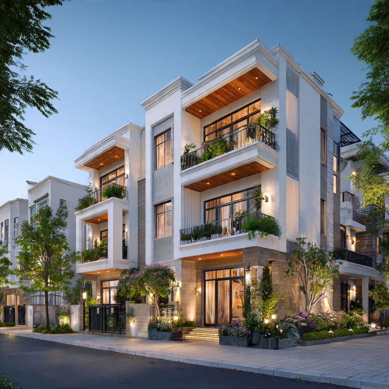 Hình 5: Xu hướng màu sơn nhà phố hiện đại 2025 – sự kết hợp hài hòa giữa gam trung tính và gam nhấn